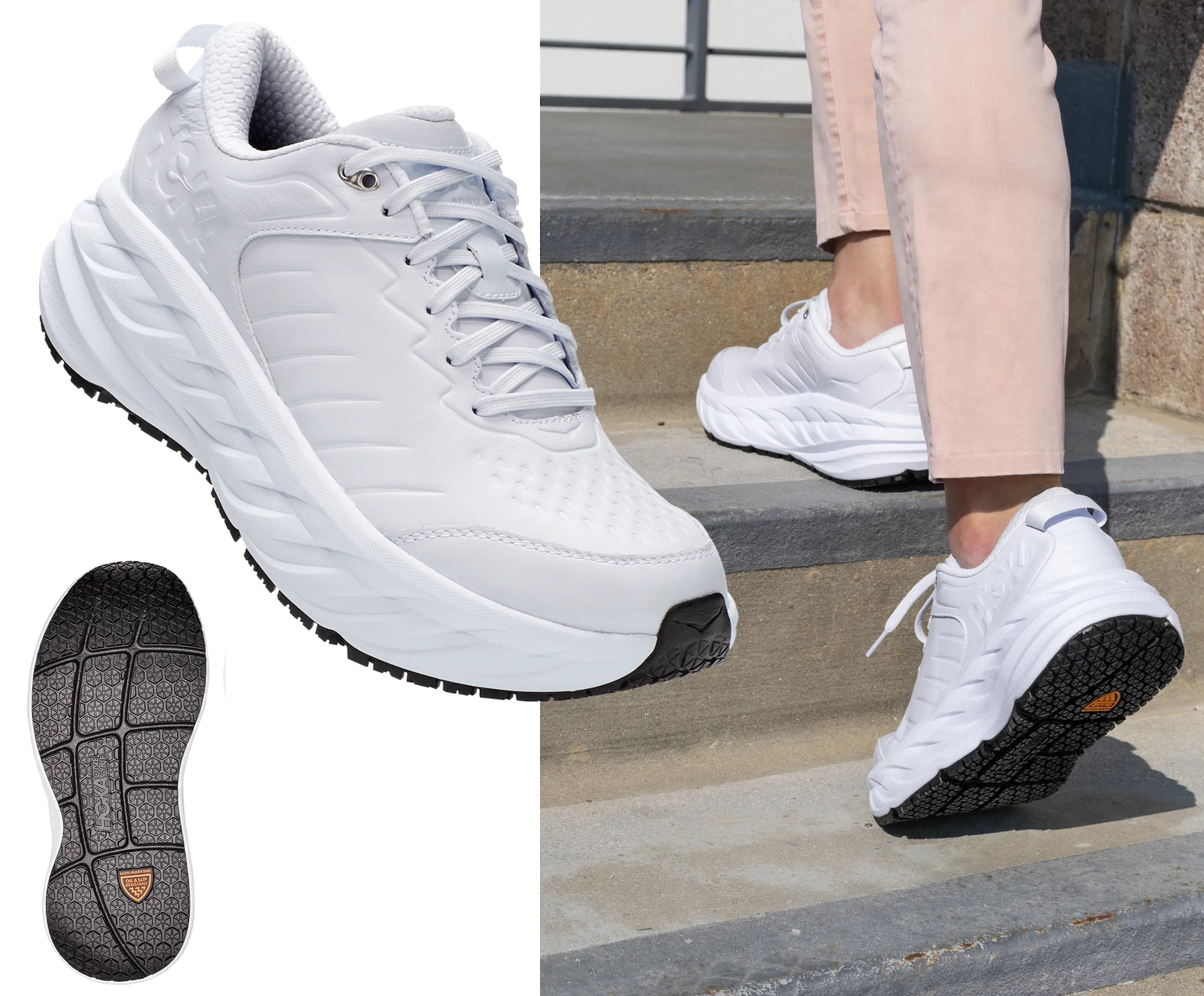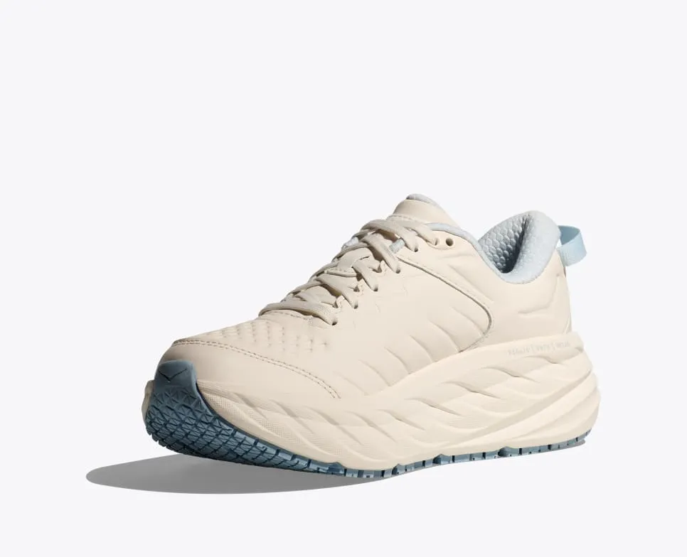 The Bondi SR takes the most cushioned shoe in the HOKA road-shoe lineup and reworks the silhouette to handle the demands of daily life. Updated with water-resistant leather, a slip-resistant outsole and EVA midsole to ensure all-day cushion, this workplace warrior features an ultra-grippy, full ground contact rubber that stands up to the demands of the service industry and medical field alike.